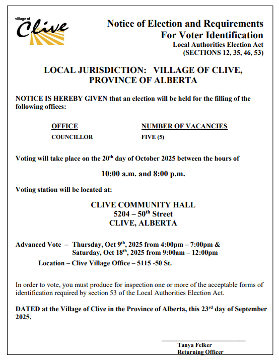 Clive is an aesthetically beautiful community of approximately 775 residents, maintaining steady growth. Located in Central Alberta, just 15 minutes east of Lacombe and only 30 minutes from Red Deer, we are an affordable and ideal spot for an enjoyable country living atmosphere with quick access to all amenities.