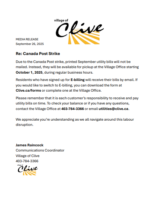 Clive itself hosts numerous services and facilities: Cafe, Banking services, Insurance Agency, Post office, Pharmacy, Grocery store, Motel, Sports Bar, Hair Salon, Thrift Store, Liquor Store, Public Library, FCSS services, Food Bank, Car Wash, numerous home-based businesses, Arena, Curling rink, skateboard park, soccer field, and baseball diamonds. These are just some of our advantages, not to mention our service clubs and volunteers and a fire department that is second to none.
